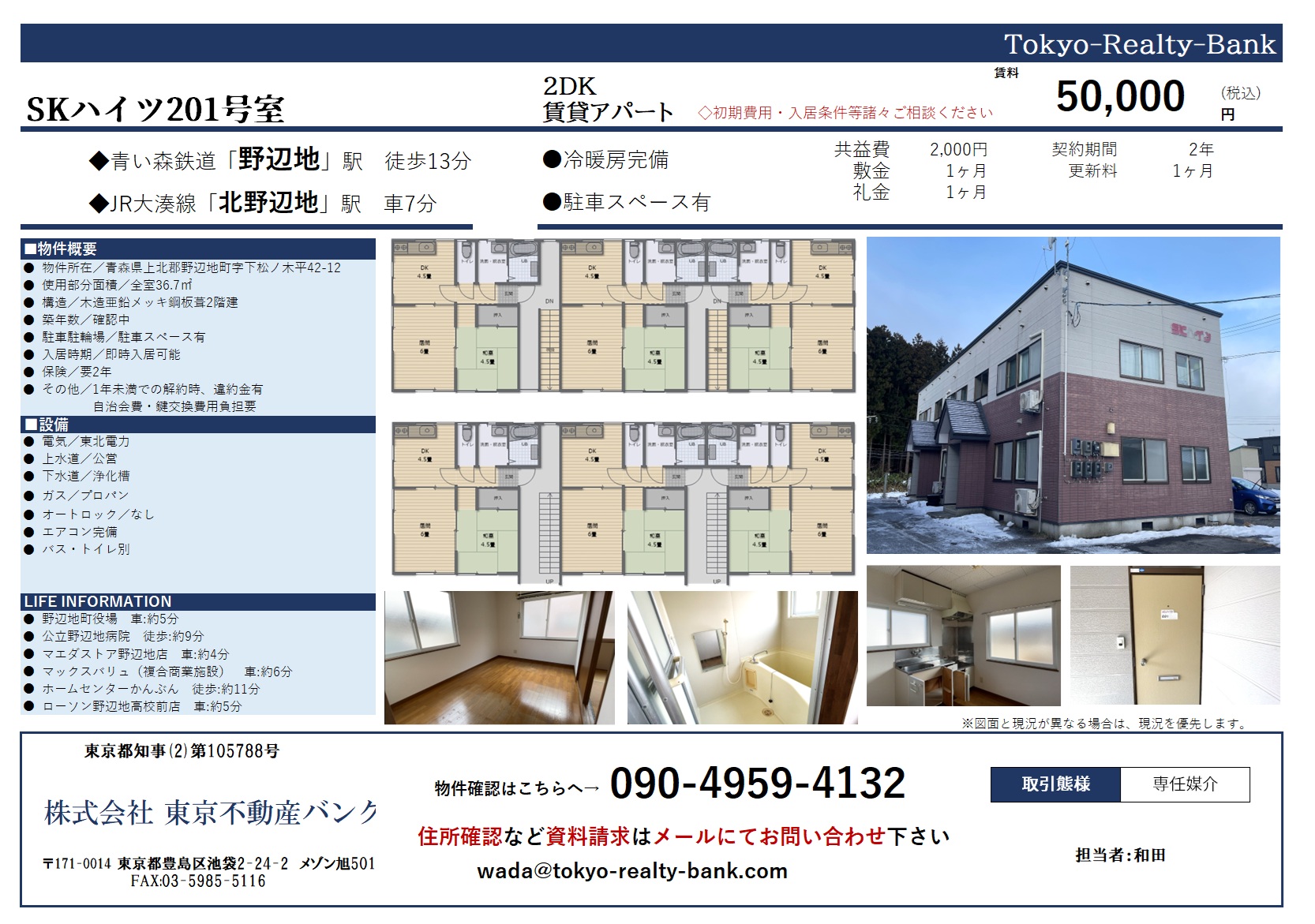 現在、野辺地町のアパート「SKハイツ」で入居者を募集しています!